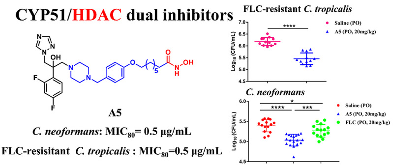 基于此,徐德鋒團(tuán)隊(duì)采用關(guān)鍵藥效團(tuán)融合原理,將CYP51抑制劑的Triazole和Phenyl同HDAC抑制劑的Linker和ZBG四個(gè)藥效團(tuán)進(jìn)行融合,設(shè)計(jì)了CYP51/HDAC雙靶點(diǎn)抑制劑。其中化合物A5顯著降低了小鼠的腎臟和腦部荷菌量,并且其抑制小鼠腦部荷菌量效果優(yōu)于陽(yáng)性藥FLC(圖1)。