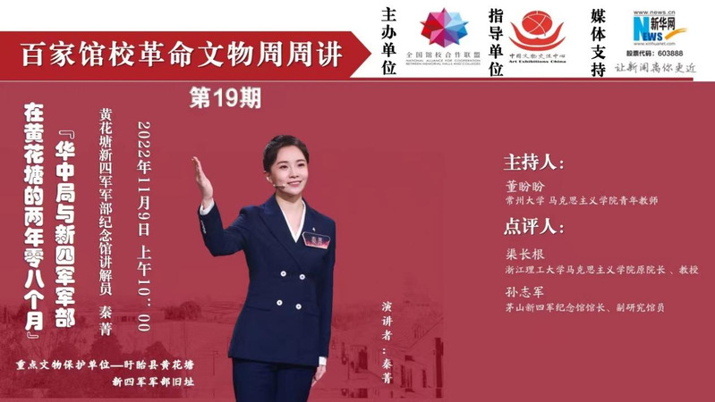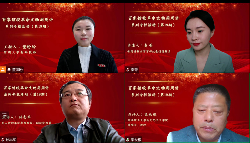 近日,為推動用好用活革命文物工作,由全國館校合作聯盟主辦,中國文物交流中心指導,新華網作為媒體支持,常州大學馬克思主義學院、常州大學近現代史與紅色文化研究院聯袂推出“百家館校革命文物周周講”系列專欄第19期網絡課程活動。本期邀請了黃花塘新四軍軍部紀念館講解員秦菁擔任講述人,浙江理工大學馬克思主義學院原院長、紅色文化研究院院長渠長根教授與茅山新四軍紀念館館長、副研究館員孫志軍擔任點評嘉賓。來自全國館校合作聯盟理事單位的常州大學、浙江理工大學、黃花塘新四軍軍部紀念館、聊城職業技術學院等高校部分師生及博物館人,通過線上方式參加活動。常州大學馬克思主義學院教師董盼盼主持活動。