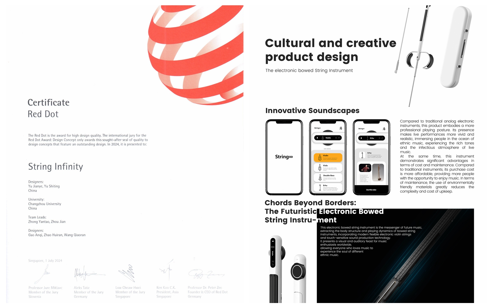 近日,備受全球設計界矚目的國際三大頂級設計獎之一德國紅點設計獎(Red Dot Design Award)2024年紅點設計概念獎揭曉。我校美術與設計學院鐘硯濤教授、高安琪老師、趙慧冉同學(2022級研究生)等共同創作的作品《文創產品設計——電子弓弦樂器String Infinity》斬獲設計概念獎,作品以“以人為本”的設計理念和多功能性,因其卓越的創意在60 多個國家、地區的參賽作品中脫穎而出。
