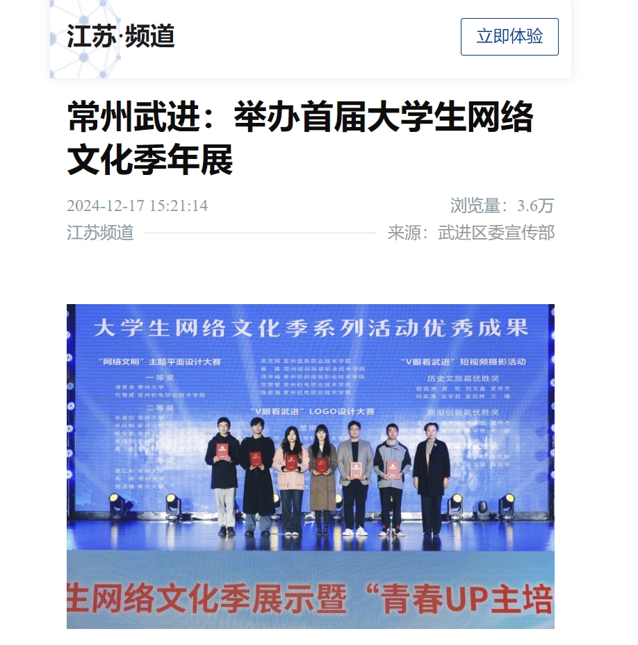 12月12日,“青春有我”2024年度大學(xué)生網(wǎng)絡(luò)文化季展示暨“青春UP主培育行動”發(fā)布活動在常州工程職業(yè)技術(shù)學(xué)院舉行,集中展示大學(xué)生網(wǎng)絡(luò)文化季成果,讓青春與互聯(lián)網(wǎng)交融碰撞。至此,為期半年的武進區(qū)首屆大學(xué)生網(wǎng)絡(luò)文化季暨網(wǎng)絡(luò)思政共建行動圓滿落下帷幕。