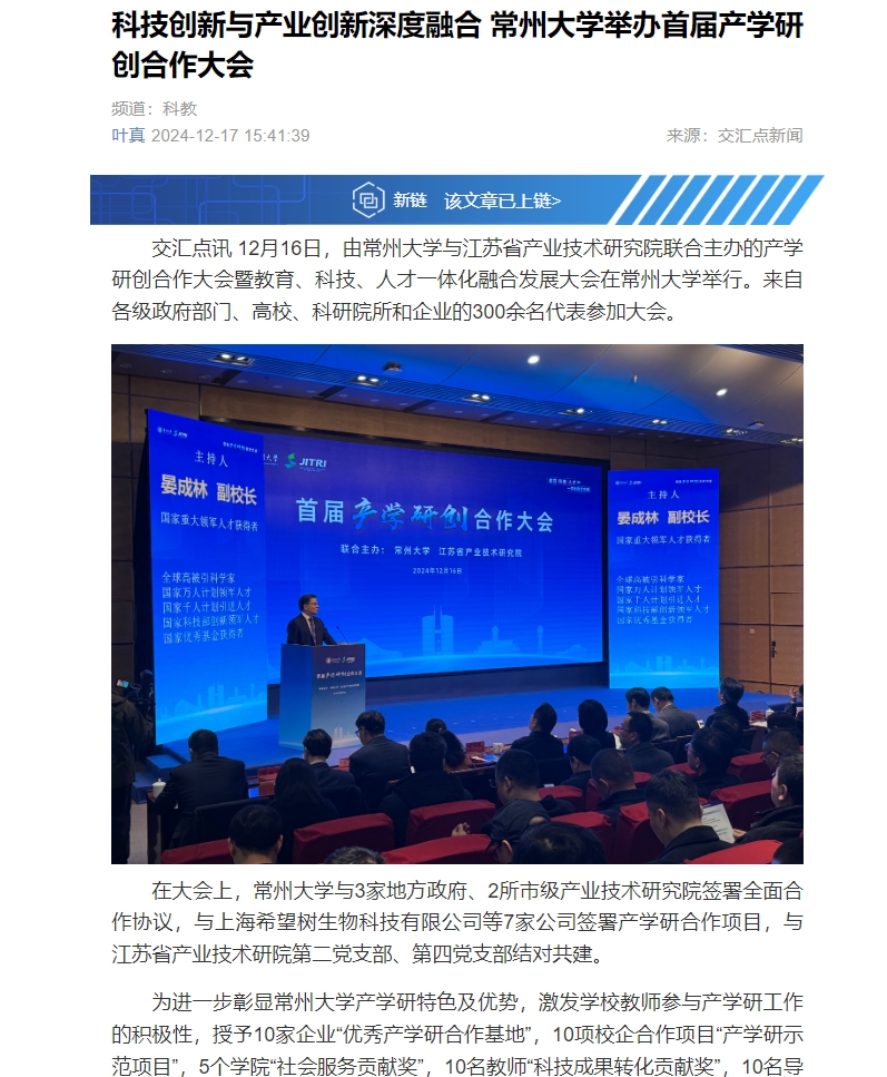 12月16日,由常州大學與江蘇省產業技術研究院聯合主辦的產學研創合作大會暨教育、科技、人才一體化融合發展大會在常州大學舉行。來自各級政府部門、高校、科研院所和企業的300余名代表參加大會。